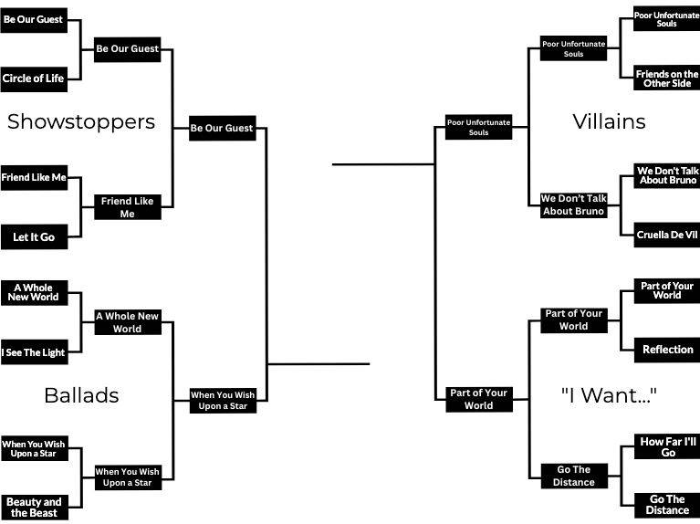 And speaking of favorites to win it all, “When You Wish Upon a Star" has dominated en route to the Final 4. “Beauty and the Beast" and “A Whole New World" fell victim to what could be considered the Disney theme song and beloved Pinocchio tune. The dominant performance to this point could be very telling as to which song we might be crowning the very best when all is said and done.