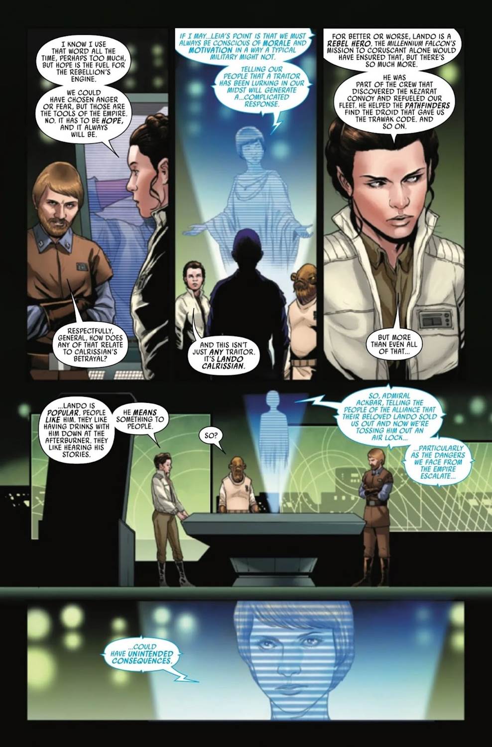 Meanwhile on the “pretty fancy" (in Lando’s words) world of Uveron, where Mon Mothma has traveled on a fundraising mission for the Alliance, an unnamed group of assailants glide into action using winged suits, though we won’t discover their target until later in the comic (it’s fairly easy to guess who they’re after). Back on Home One, Salli Georgio arrives after being transported by Chewbacca and is welcomed by Leia and Luke Skywalker. Declining to meet with her client, Georgio instead opts to refresh in her room, and the trial begins the next day. She makes several attempts to delay the proceedings, but Madine shuts them down and the prosecutor Captain Darrien Muskray (newly introduced here) begins his rather convincing arguments. His chief witness is the Talky droid that Lando stole from rebel storage and dumped into Jabba’s possession along with his indispensable Trawak code data.