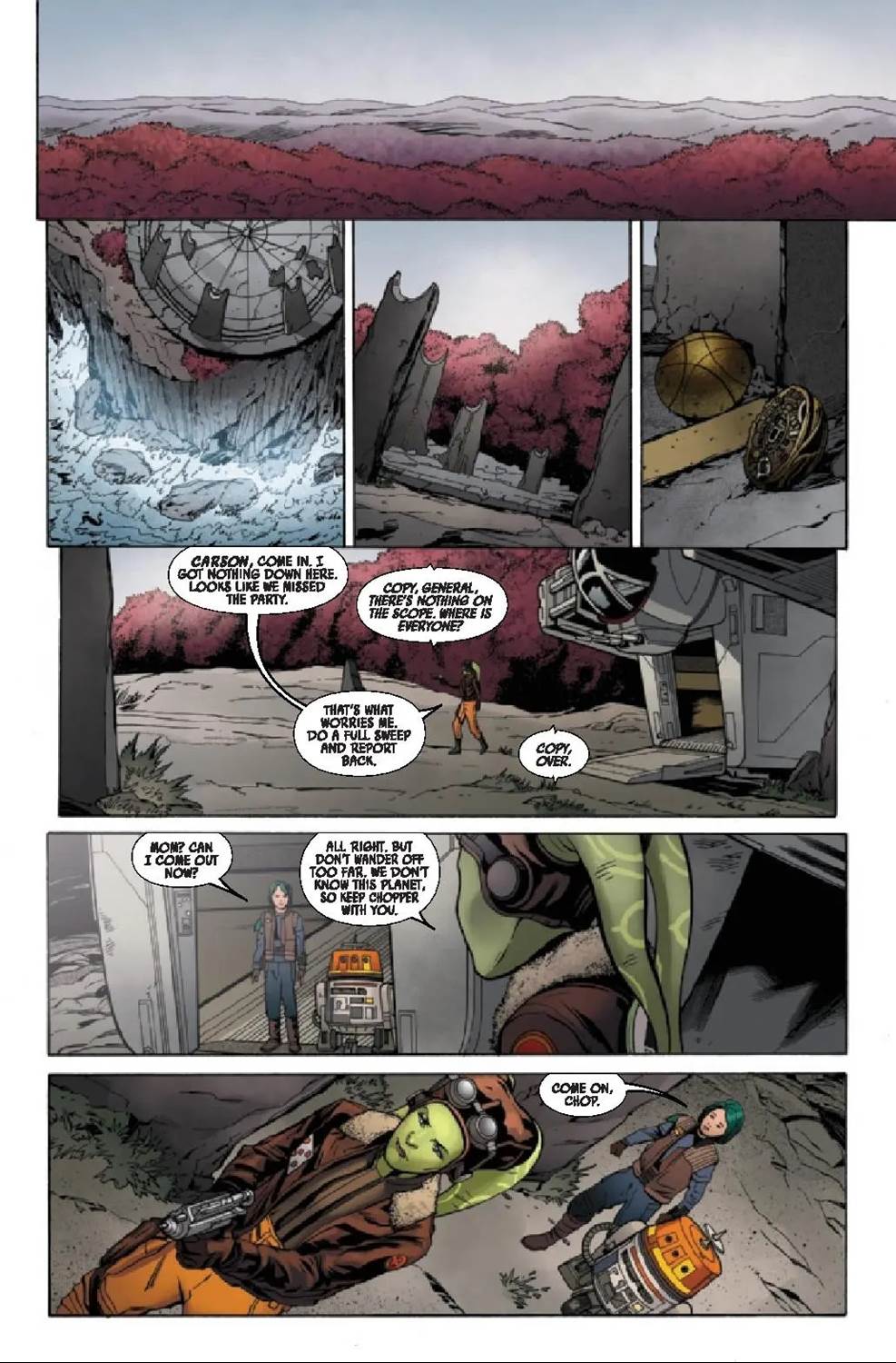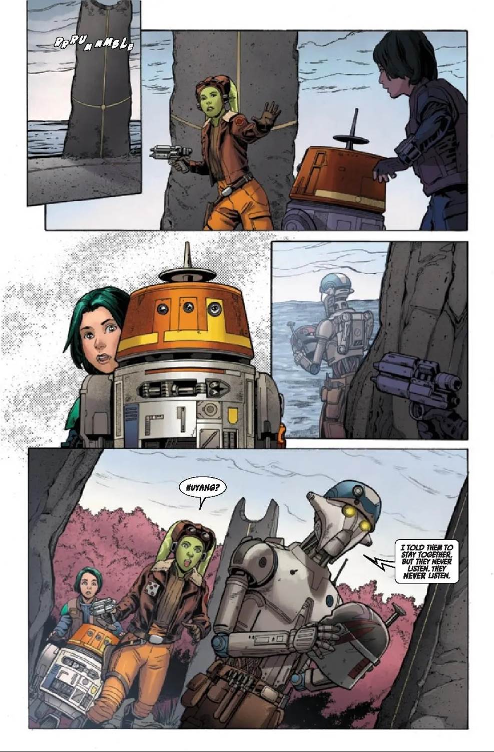 Here the comics, much like the television series episode before it, alternates back and forth between our heroes on Seatos and Ahsoka “completing her training" as she relives battles from the Clone Wars with Anakin in that other, more ethereal realm. Again, Barnes and Cummings as a talented creative partnership have chosen to (or were more likely instructed to by Lucasfilm and Marvel) hew extremely closely to what happened in the show, so there aren’t a lot of surprises here, though I feel they both did a good job in recapturing the mysticism and mood of this installment that had prequel trilogy and Star Wars: The Clone Wars animated series fans cheering for the long-awaited reunion between master and apprentice.