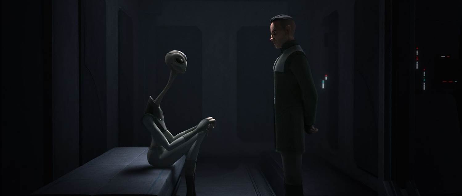 Meanwhile, back on Weyland (the planet that houses the Mount Tantiss facility), Dr. Royce Hemlock (Jimmi Simpson) interrogates Nala Se (Gwendoline Yeo) about Omega and Crosshair’s escape. During this conversation, Nala Se claims that Omega’s shocking blood test results were a “false positive," but this doesn’t deter Hemlock from wanting to capture the clone once again. Then we cut to our heroes, who have walked to the spaceport in the hopes of boarding another shuttle off-world. They don’t have chain codes they can show to the customs officer, so Omega offers to make a bribe, which turns out to be much steeper than she was anticipating. This forces our two travelers to come up with another plan– card gambling in a nearby cantina.