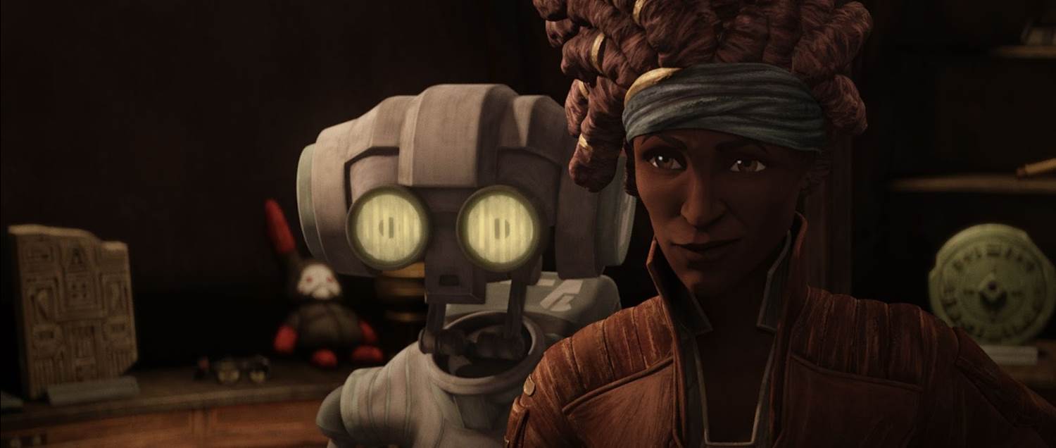 Meanwhile on Pabu, the members of the Bad Batch regroup after the Imperial occupation of the island-planet comes to an end… I’m not sure it makes a lot of sense that the Empire would leave Clone Force 99 alive considering how willing and capable they’ve proven themselves to rescue Omega before. Regardless, they immediately try to come up with a way to find Tantiss, and Crosshair conveniently drops that he may know a way to locate the facility. Apparently he was reluctant to share it before because he didn’t really want to return there, but now that they have Omega again he doesn’t really have a choice. Anyway, Phee Genoa (Wanda Sykes) shows up and offers to take them where they need to go– an Imperial labor camp where the former Vice Admiral Rampart (Noshir Dalal)– who had previously been arrested by Grand Vizier Mas Amedda in season two– is serving time. Sadly it’s not any of the labor camps or prisons we’ve seen on The Mandalorian or Andor, but it still looks like an unpleasant place to live out the rest of your life anyway.