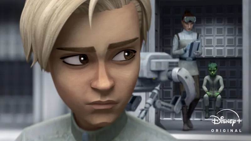 Meanwhile in the Vault, Omega (Michelle Ang) hears the laser cannon blasts from outside and rightly assumes that her brothers in the Bad Batch have tracked down her location. When the science vessel lands, Hemlock orders the ship to be searched thoroughly and the crew scanned with Echo still aboard. In the jungle, the other three members of Clone Force 99 reunite after the crash, and Hunter admits that Rampart “unfortunately" also survived. They head toward Mount Tantiss, dodging the Imperial craft buzzing overhead, and wind up encountering one of the fearsome beasts that wreaked havoc in this year’s season premiere. Rampart runs away screaming and the others are left to fend for themselves against the creature, while on the ship Echo is accosted by a protocol droid who he blasts and takes its robotic hand to use as part of his disguise, joining a squadron of other troopers.