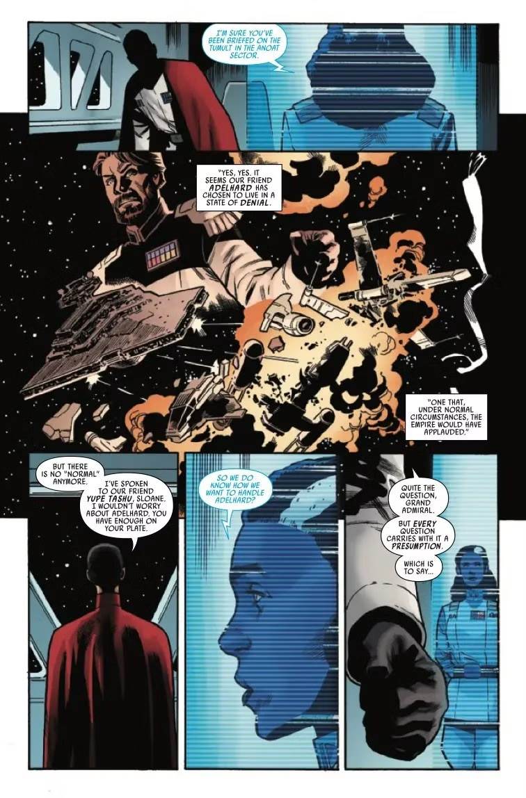 The Battle of Jakku - Insurgency Rising #2 begins with a shadowy conversation among the Acolytes of the Beyond (see the Star Wars: Aftermath book trilogy for more), wherein their further plans are set into motion. Then writer Alex Segura and artist Leonard Kirk cut to the Super Star Destroyer Ravager, where one of Emperor Palpatine’s Sentinel droids (from the Star Wars: Shattered Empire comic miniseries) initiates Operation: Cinder (which plays out in the Star Wars: Alphabet Squadron novels), and then Grand Admiral Rae Sloane (from Star Wars: A New Dawn and numerous other stories set during this period) appears in hologram form before an unnamed Imperial commander– using context clues I believe this to be Gallius Rax, whose code name is Operator. Rax dismisses Sloane’s concerns about Moff Adelhard, and insists that the problem “is already being handled." Then in the Anoat Sector, we see Adelhard execute a Rebel Alliance soldier who dares confront him with the concept that the Empire has fallen. Adelhard then takes other soldiers prisoner and orders his lieutenant to interrogate them for information “about this so-called New Republic."
