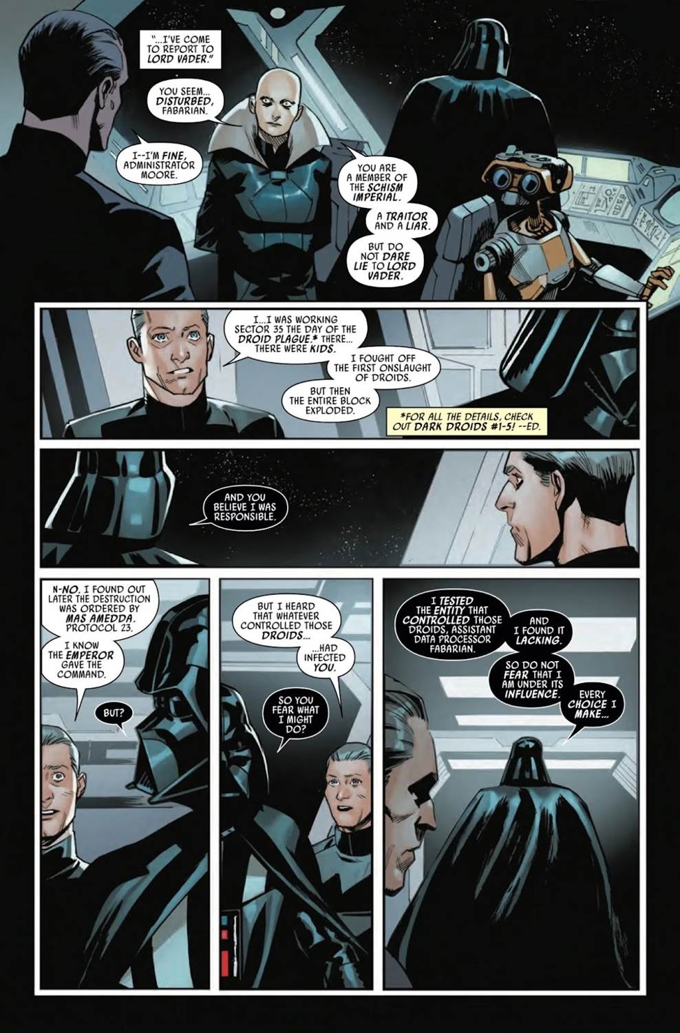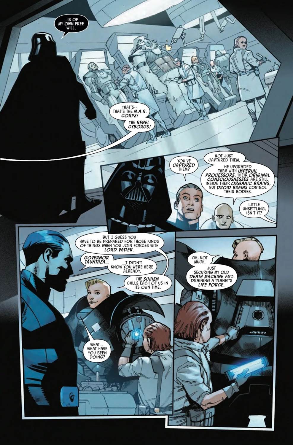 Next Pak and his artists Adam Gorham and Paul Fry cut to space, where Fabarian is on an Imperial Shuttle heading to meet with Sub-Administrator Sly Moore and the rest of the Schism Imperial, including Darth Vader himself. Fabarian admits that he’s a little afraid of Vader, having heard that the Droid Scourge had infected the Dark Lord. But Vader insists that all of his actions are of his own free will, and introduces Fabarian to the M.A.R. Corps– a group of Rebel Alliance cyborgs that have now been corrupted by Imperial technology. We also get reacquainted with Governor Tauntaza who says she has joined the Schism to reclaim her “death machine," using it to drain a planet’s life force and powering her armor with it. And then we get the big reveal that Fabarian has actually manipulated his way into the baron’s office in order to hack into his computer system– revealing that the industrialist is manufacturing a new model of battle droid for the Empire.