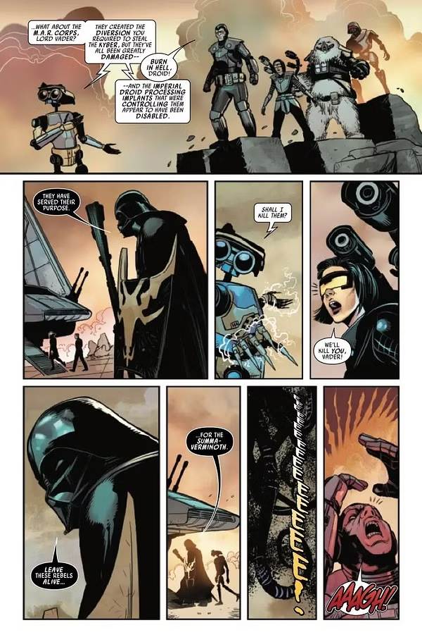 Darth Vader #47 begins on the Sith planet of Exegol, where the titular Dark Lord has raided Emperor Palpatine’s vaults and stolen an enormous Kyber crystal, much like the one that was used to power the first Death Star. Lieutenant Pryde praises Vader for his accomplishments, but other members of the Schism Imperial (like Governor Tauntaza and Sub-Administrator Sly Moore) are more tempered with their optimism. Because even as the crew makes their escape, they are pursued by members of the Sith Eternal cult, who have called down the colossal Lovecraftian beasts known as the Summa-Verminoth, which exist in the treacherous space surrounding Exegol. The forensics droid ZED-6-7 also offers to kill the remaining members of the M.A.R. Corps, whose cybernetic implants have stopped responding to Imperial commands, thus making them useless to the Schism. Vader says to leave them to the summa-verminoth and then communes with the Kyber crystal inside the Imperial shuttle.