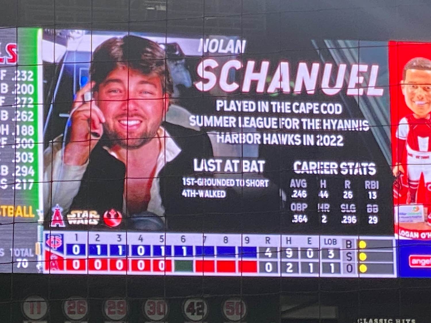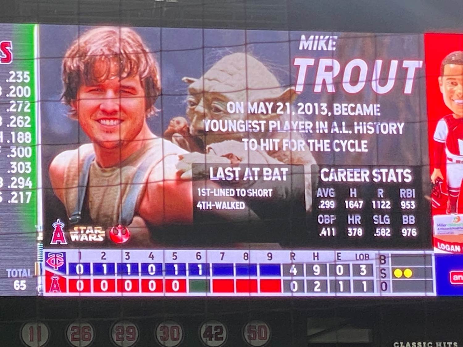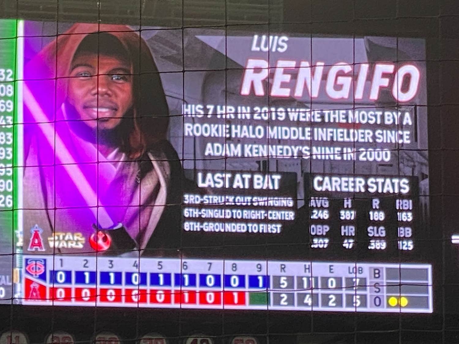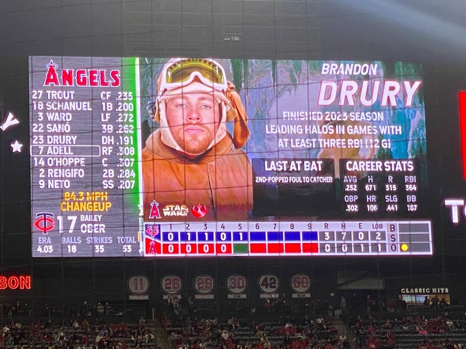 Another pretty memorable aspect of Star Wars Weekend at Angel Stadium was that each player was assigned his own Star Wars character on the scoreboard, with the visiting Minnesota Twins being represented by villains and the Angeles naturally playing hero characters.
