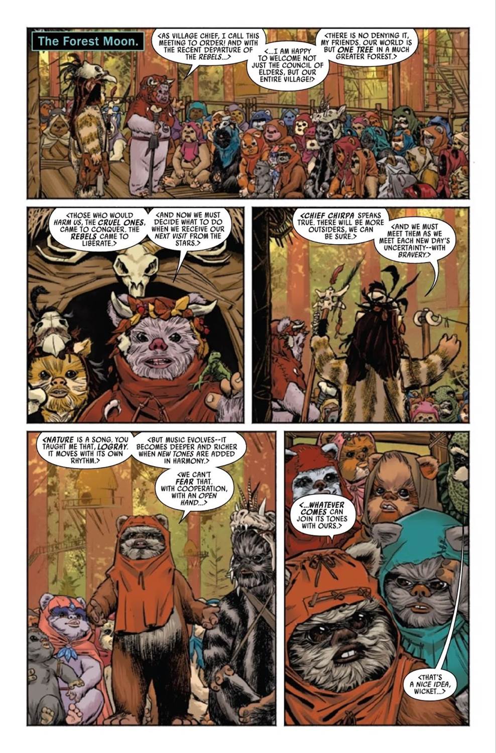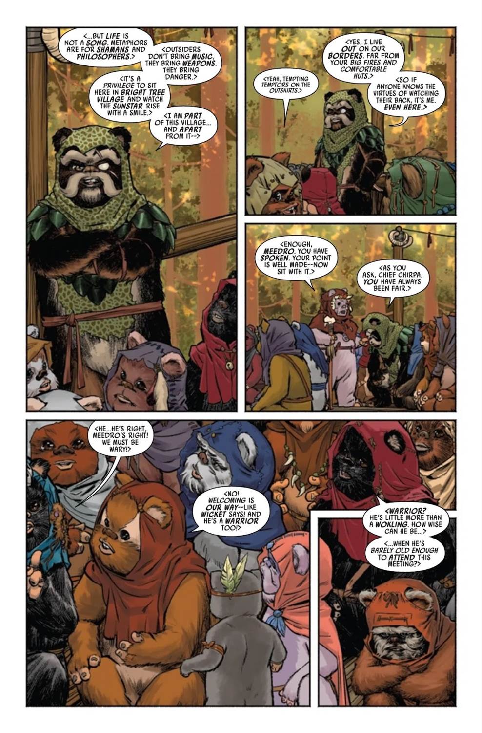 Next month marks the 40th anniversary of Lucasfilm’s made-for-TV movie Caravan of Courage: An Ewok Adventure, and in celebration of that momentous occasion Marvel Comics is putting out a four-issue Star Wars: Ewoks miniseries that also not-so-coincidentally overlaps with the events of the current Star Wars: The Battle of Jakku maxi-series. Ewoks #1 begins– where else?-- on the forest moon of Endor, where our hero Wicket W. Warrick is telling the story of Return of the Jedi’s climax to the Woklings, with this narrative being set “no so long" after the Battle of Endor. Then we cut to space, where Moff Adelhard’s fleet (see The Battle of Jakku - Insurgency Rising #1 for more on this relatively new villain) has amassed. An Imperial officer named General Tern Koyatta is ordered by Adelhard to return to Endor in an effort to recover a weapons stash left behind by the Empire on the aforementioned forest moon.