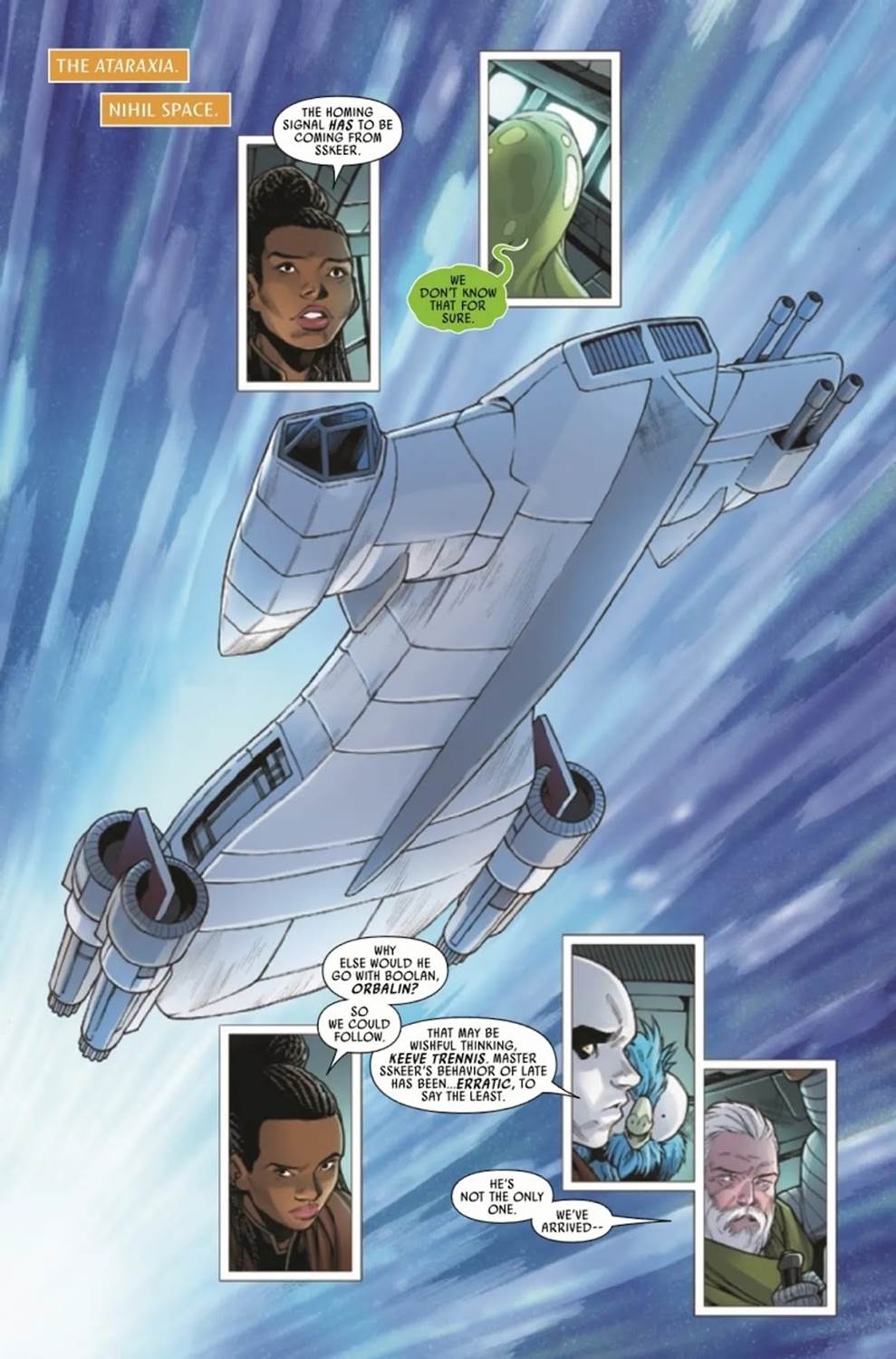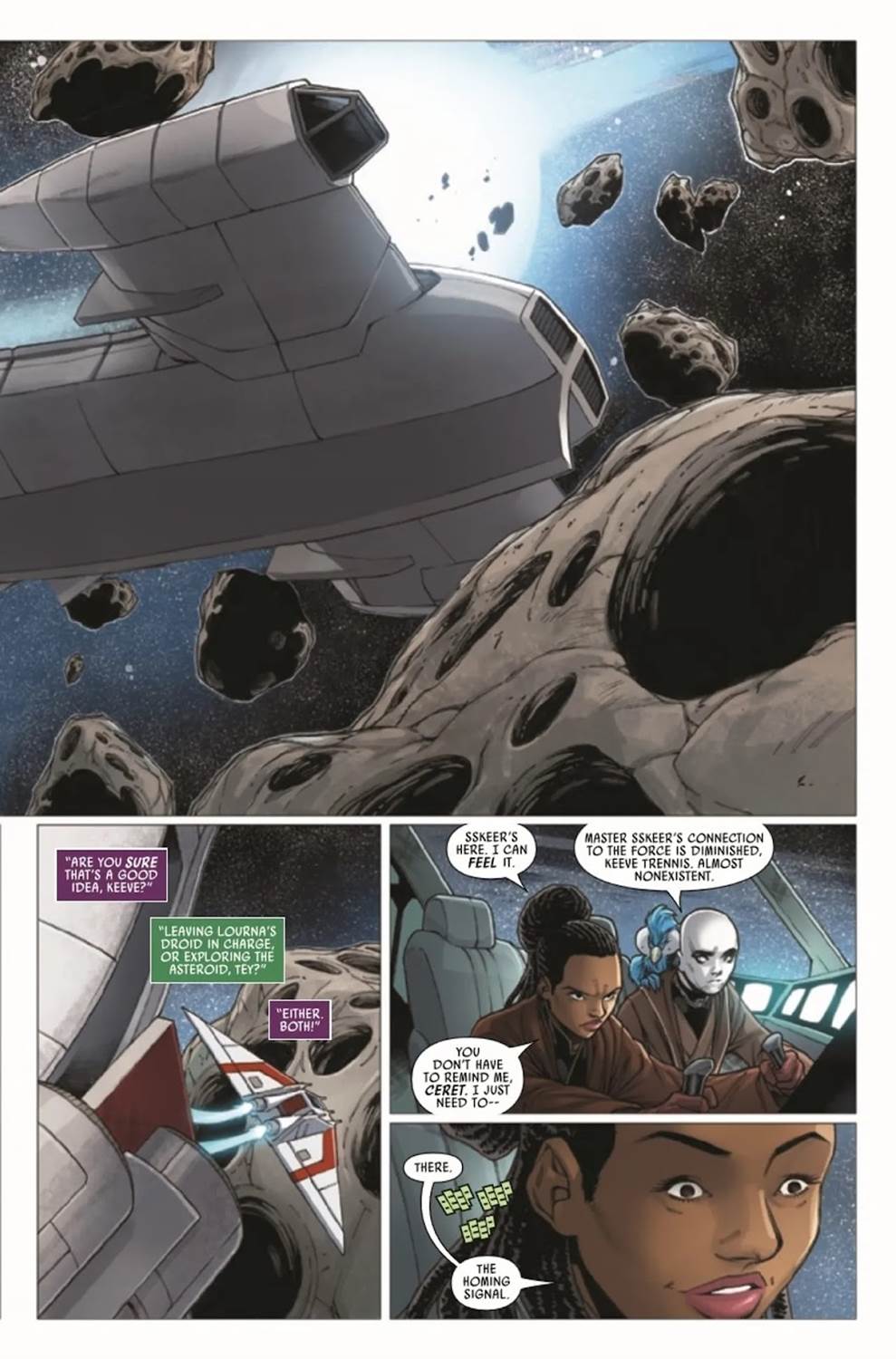 The High Republic (2023) #10 begins with our Jedi heroes aboard the Ataraxia racing toward the homing beacon that one of their allies– they’re not sure which– must have planted aboard Baron Boolan’s ship at the end of the previous issue. But when they arrive at the signal’s source, they only find an asteroid field… or so it seems before closer inspection. So it comes to be that Jedi Knights Keeve Trennis and Ceret investigate Boolan’s secret asteroid base along with Master OrbaLin, former Guardian of the Whills Tey Sirrek, and the Yacombe youngling that was being protected by Master Sskeer in previous chapters. They split up into two groups, and when Ceret, Sorrel, and the youngling round a corner, they are shocked to come face-to-face with former Nihil Lourna Dee and Ceret’s Force-bond twin Jedi Terec, both of whom had been presumed dead.