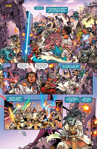 We also get another flashback providing some backstory (and an actual name!) for the villain previously known only as The Warden– now we know he started out life as Herwint Tiks and served under General Viess– similarly providing context for his approach to Eriadu as the lynchpin of the Nihil’s control over the Occlusion Zone. The Warden commands the troops attacking the planet now, and consults with Val Delvardus, the leader of the only clan of locals who sided with the Nihil. We’re witness to more plotting and strategizing on both sides, with Qort sending a few volunteer Jedi off on a secret mission to “you-know-where" (I suppose we’ll learn more about that plan in later issues) and then the full-fledged battle breaks out in earnest. There are some well-choreographed action scenes and a cool new destroyer droid named X-10 sent by Marchion Ro to assist the Warden during the conflict, and then Qort is injured during the chaos, leaving Farzala in charge of the Jedi assault on his own.
