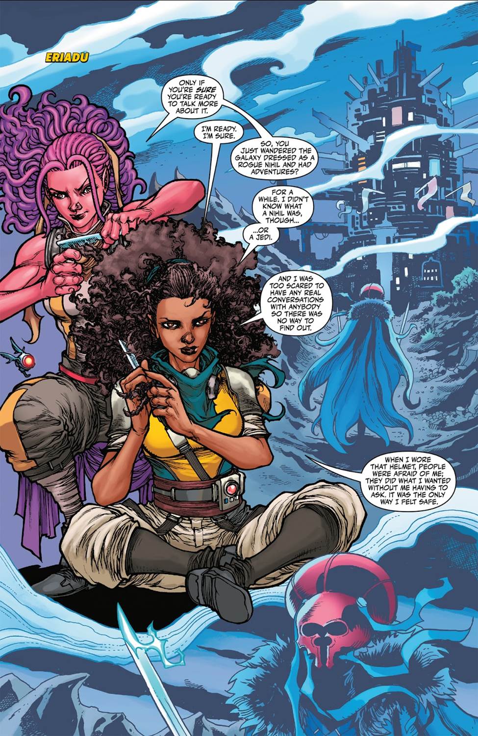 The High Republic Adventures (2023) #3 begins where the previous issue left off, with Jedi Padawan Lula Talisola having reunited with her lost love Zeen Mrala– a Force-sensitive non-Jedi of the Mikkian species. Lula has now abandoned her temporary life as a Nihil warlord and is recounting more of her journey from the fall of Starlight Beacon to the planet Eriadu. We get a few more pages of great mash-up art by illustrators Harvey Tolibao (in the “present" of the story) and Nick Brokenshire (documenting Talisola’s recent past), and then the two young women are also reunited with the galactic superstar Svi’no Atchapat (from writer Daniel José Older’s 2022 young-adult novel Star Wars: The High Republic - Midnight Horizon), while Lula recovers more memories of her conflict with Krix Kamerat prior to Starlight Beacon’s fall.