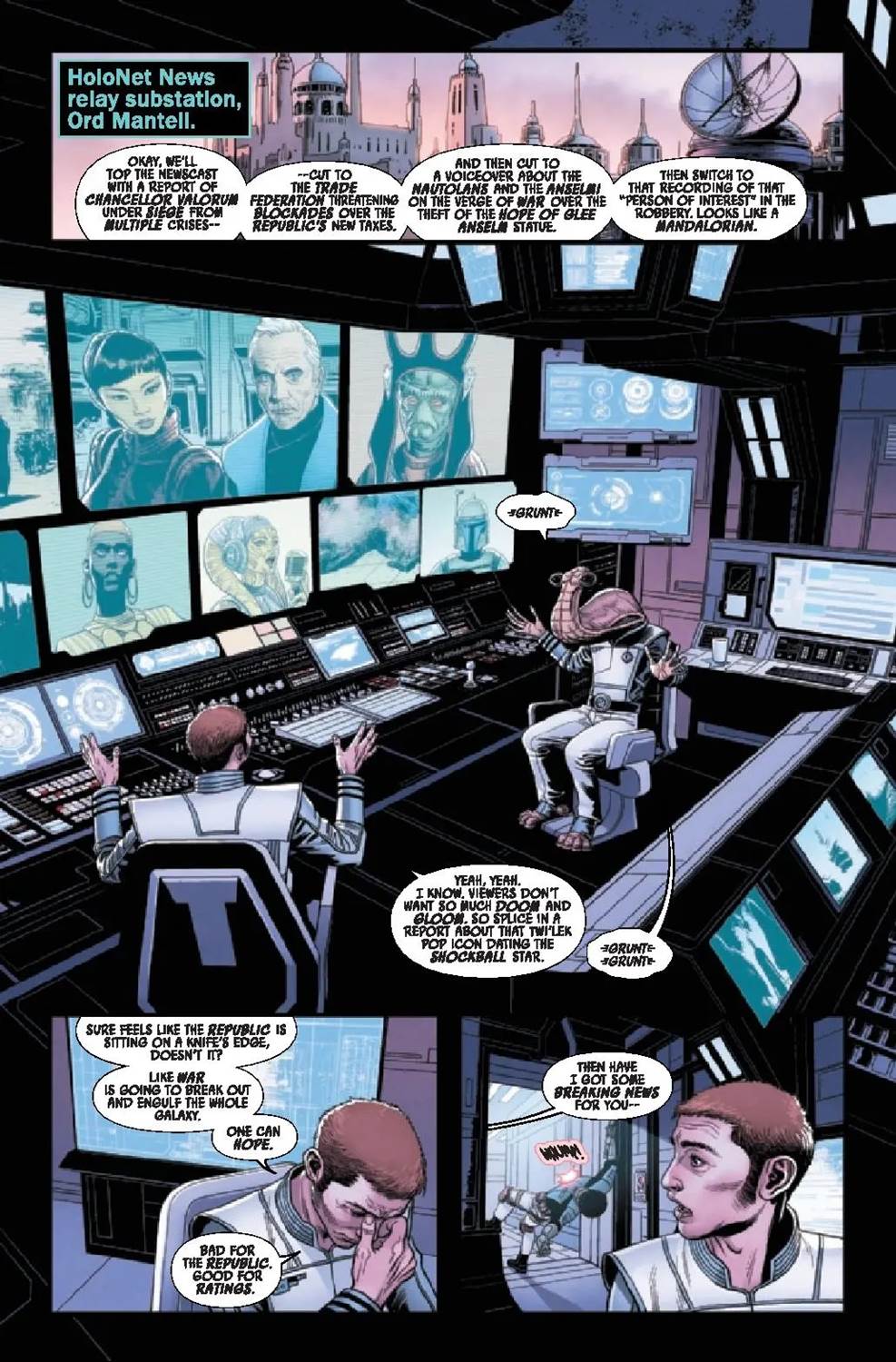 Jango Fett #4 begins on Ord Mantell, where a HoloNet News crew broadcasts current-event stories from around the galaxy. Suddenly the titular bounty hunter breaks into the station along with his cohorts Aurra Sing and Nakano Lash, who demand to see any and all footage from the recent heist of the Hope of Glee Anselm statue. While watching the footage, Lash realizes that it must have been the Nautolan Ambassador Fiarok who set up Nakano’s crew to take the fall for the crime, switching out the statue with a fake. So Jango and Aurra take an RX-series camera droid from the HoloNet station and leave Lash to her own devices instead of turning her in, inspiring her to go on to become a bounty hunter (as we see in writer Ethan Sacks’ other series Star Wars: Bounty Hunters, which is set later on in the timeline). Then they travel toward the planet Jaloria aboard the Slave I, while having a fairly on-the-nose discussion about whether or not Fett is ready to become a father (this comic is set just before the beginning of the Star Wars prequel trilogy, so young clone Boba has not been “born" yet).