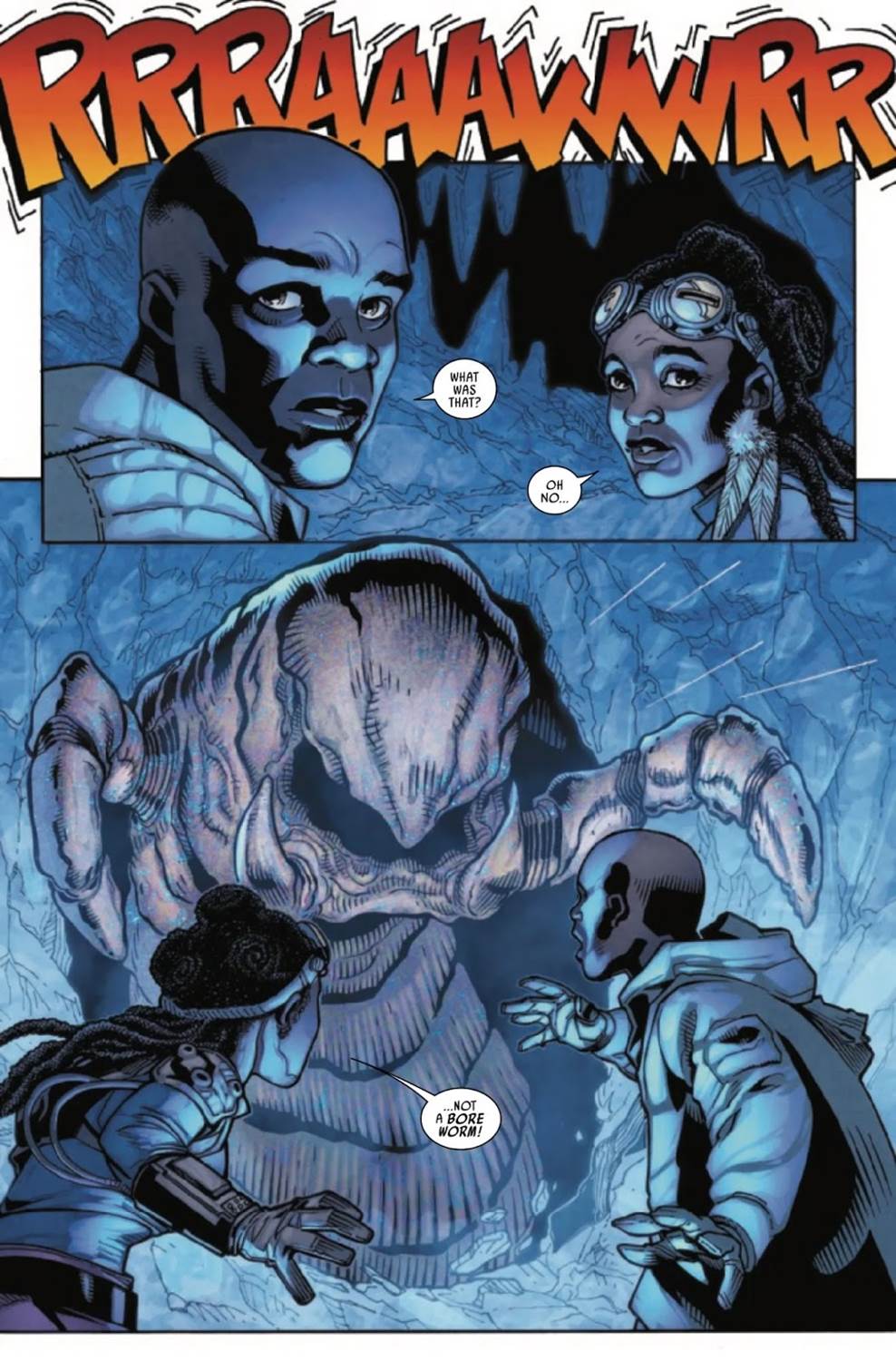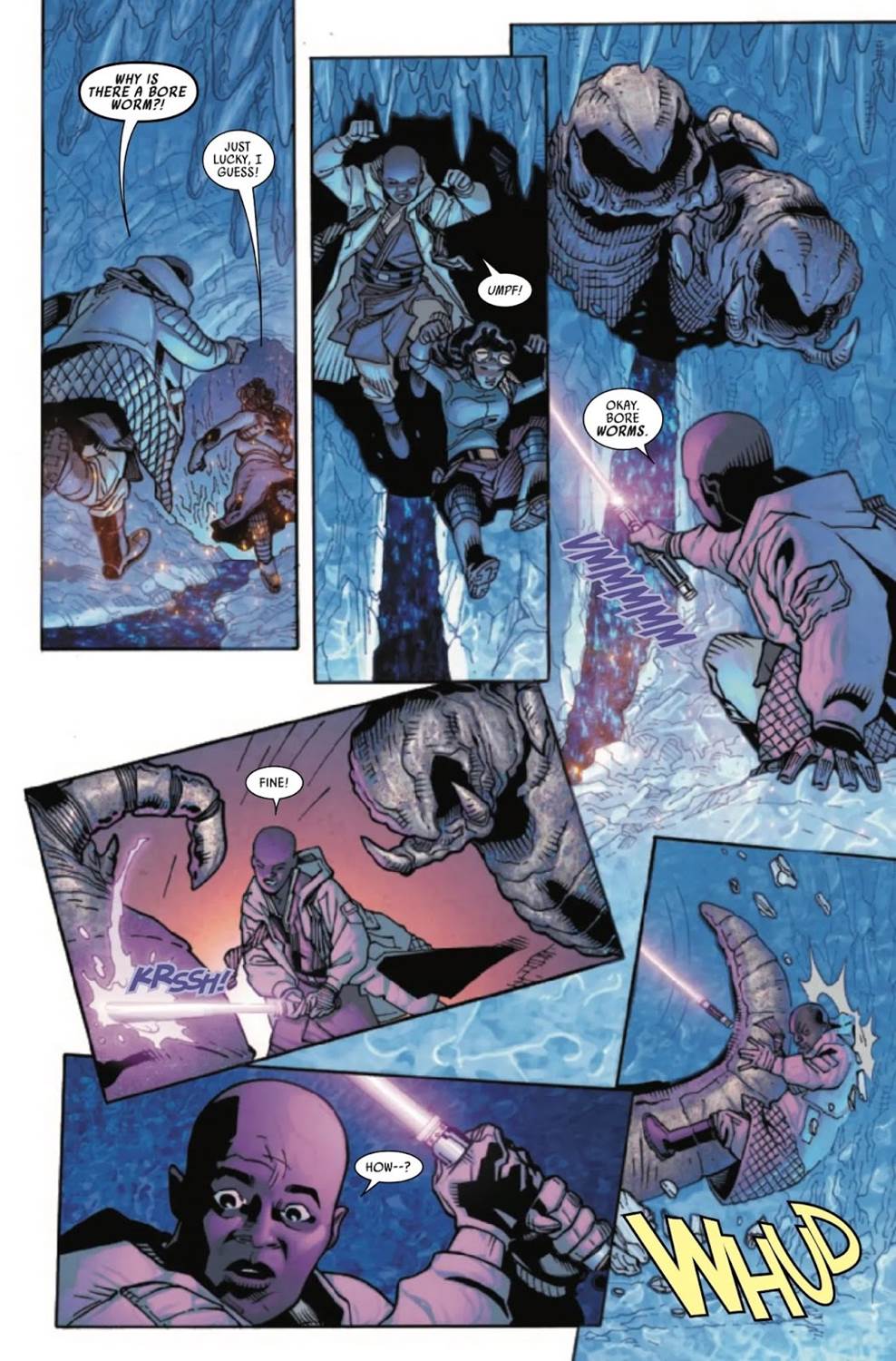 Mace Windu #2 begins where the previous issue left off– with the titular Jedi Master having caught up with pirate Azita Cruuz on the refinery moon of Ro Mira. Cruuz takes Mace through a hidden entrance into an underground tunnel system, where they chat as they walk, not to mention encounter some blue-hot lava flows and so-called “Bore Worms." Are you still in the mood for more worms after the Sandworms in Dune: Part 2 and the Ice-Wyrms in last week’s episode of Star Wars: The Bad Batch? Then you’re in the right place, because this issue has a lot of worm-related action, along with some interesting conversation between our protagonist and his new acquaintance. We learn about Azita’s job as a smuggler and get her philosophical take on free will before the worms attack, and then she shows Windu the glittering source of a new type of Coaxium Ultra hyperfuel deep within the caves.
