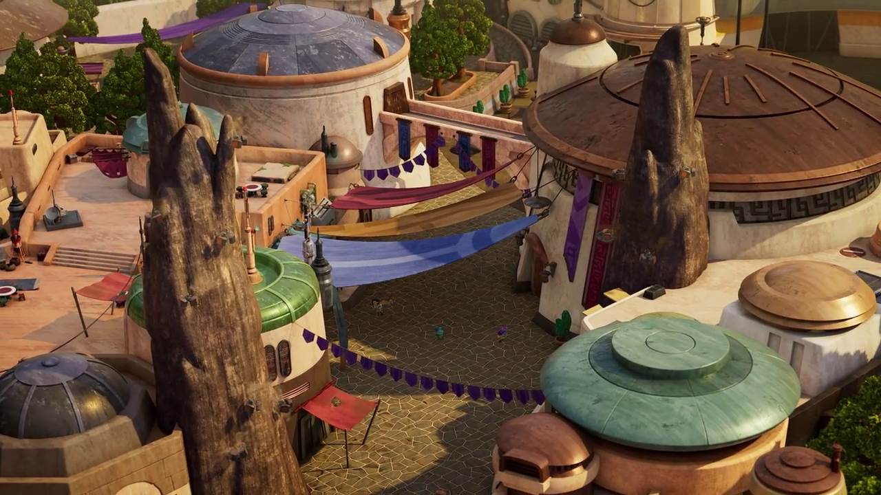 In “The Tale of the Short Spire," the Jedi-in-training Kai Brightstar (voiced by Jamaal Avery Jr.), Lys Solay (Juliet Donenfeld), and Nubs (Dee Bradley Baker) travel to Batuu to visit the Jedi temple located in the wilderness of the planet– first seen in the Star Wars: Tales from the Galaxy’s Edge virtual-reality game. They are partnered with Jedi Padawan Celesta Kami (Julia Rehwald) when her Master Carver Drow (Keston John) sends them on a mission to Black Spire Outpost, where they discover that a shady businessman named Ozon Nimbee (Gary Anthony Williams) is plotting to cut down the city’s famous spires to make way for a futuristic new development. During their visit there are references to the local Cantina, the Marketplace, and the Milk Stand (the blue and green milk are even used to short-circuit some pesky droids), plus glimpses of other buildings you’d see on a visit to Galaxy’s Edge– the geography of Black Spire is fairly accurate to Disney Parks (or to be more accurate, Disneyland specifically, as our friend Nick Tierce pointed out). The kids in the settlement are also playing a bocce ball-like game that I would love to see incorporated into the immersive experiences at Disneyland Resort and Walt Disney World.