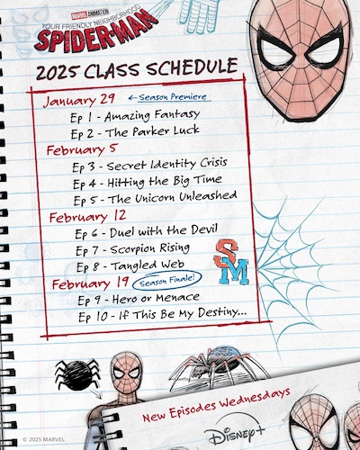 - The episode guide for Your Friendly Neighborhood Spider-Man, framed as the “2025 Class Schedule," has been revealed.