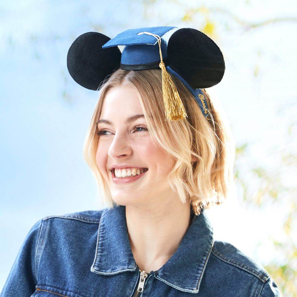 - The Ear Headband style is a popular choice and features a miniature graduation cap—complete with gold tassel—in the center of the traditional Mickey Ears design. The cap and headband are presented in traditional blue and golden embroidery script on the side reads, “Class of 2024."