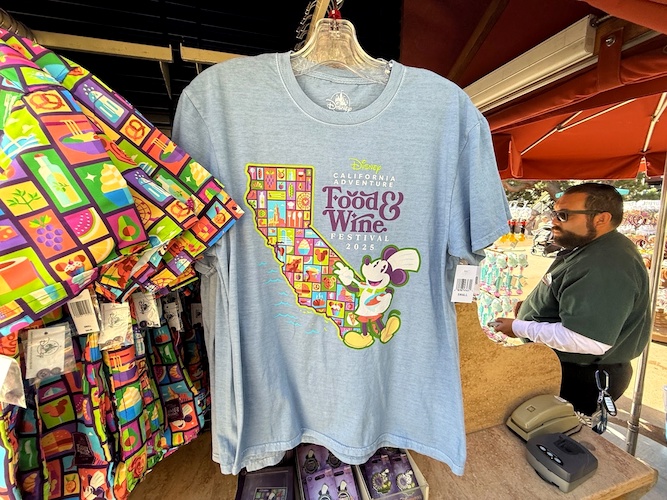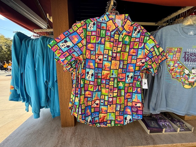 Apparel items include a delightful button-up shirt featuring various icons from Disney California Adventure and the Food & Wine Festival, along with a T-Shirt that also makes use of the same design within the shape of California.