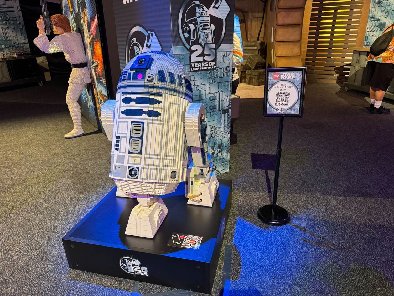 R2-D2 is the mascot for the anniversary, and a life-size LEGO R2-D2 was also in the exhibit, which lights up. It will be touring the country, so keep your eyes peeled at your local LEGO Store in case he rolls into town. He was made for selfies, with a special frame that fans can unlock when scanning the QR code on his base.