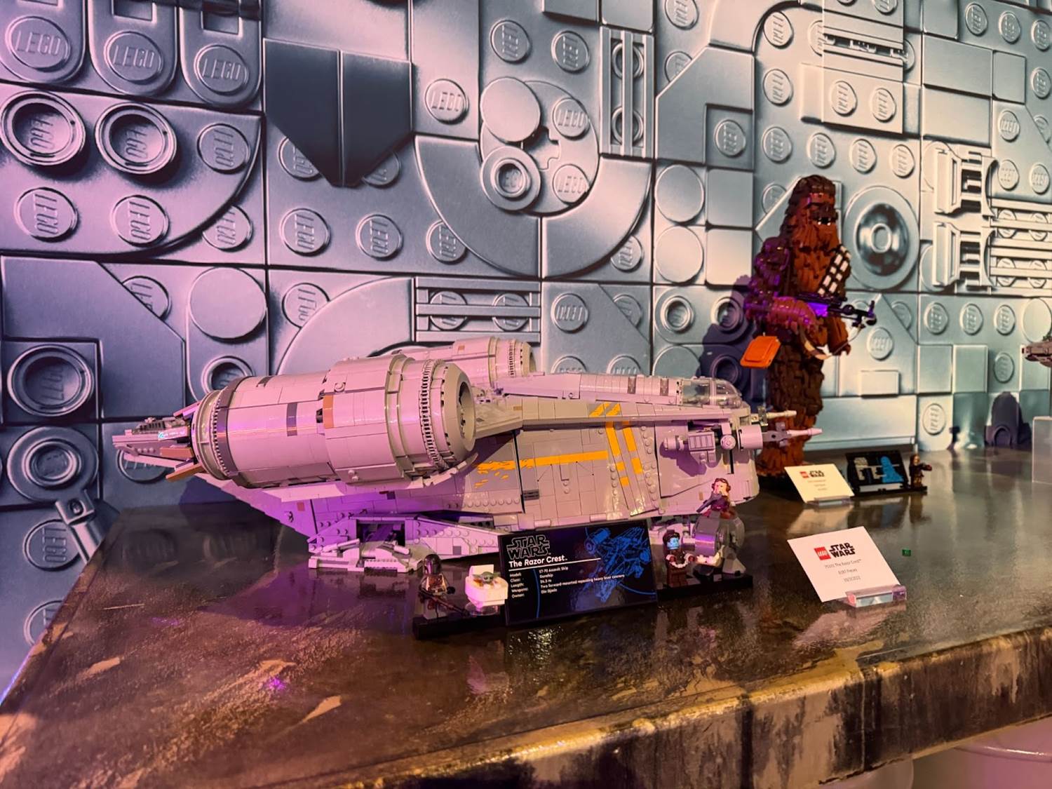 The showcase also included displays of products already available. From the world of The Mandalorian comes The Razor Crest starship, which includes minifigures of The Mandalorian, Grogu, The Mythrol, Kuiil, and a Blurrg. This build is 6,186 pieces and once completed, measures 9 inches high, 28 inches long, and 19.5 inches wide.