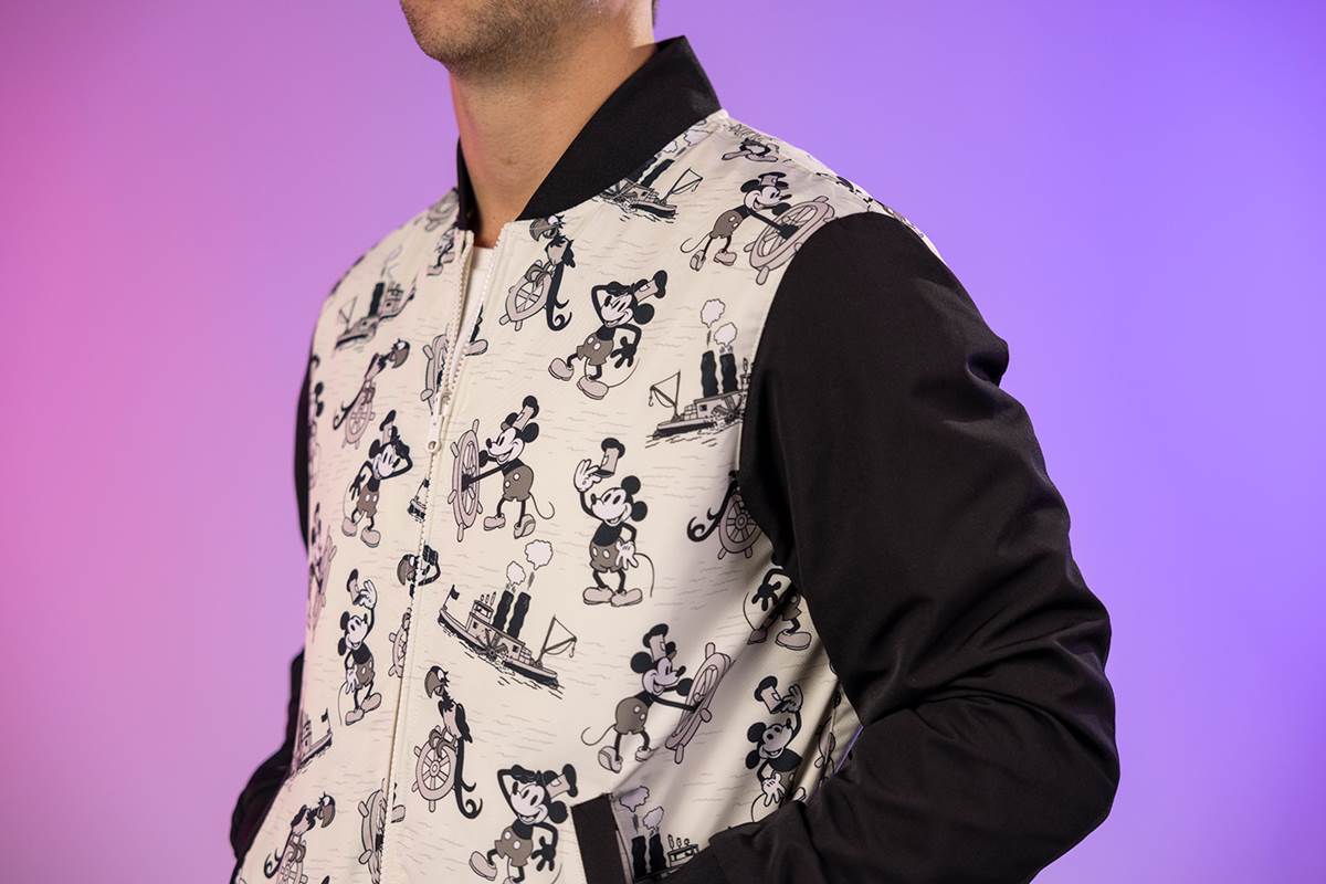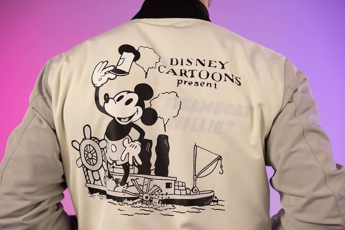 The star piece in this drop is the Limited Edition “Steamboat Mickey" Reversible Bomber Jacket ($85). The unisex cut and dual sided designs make it a versatile item for Disney fans and is a great outer layer for those chilly fall days. One side features the black and white “Steamboat Mickey" pattern accented with solid black sleeves, collar and hem. The reverse is an off white background featuring a small Steamboat Willie logo on the chest while the back boasts a large image of Mickey and the steamboat among the words “Disney Cartoons Presents" and “Steamboat Willie." The black collar stays, but the sleeves are now greyscale like an old fashioned cartoon!