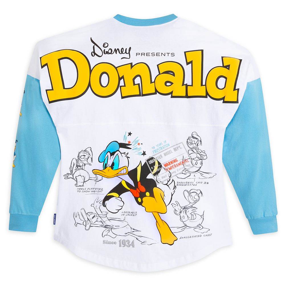 - As you can see in the picture above, the Spirit Jersey is one of the key pieces and this particular design uses color blocking on the sleeves (blue) while a majority of the shirt is white. The back features a large, colored graphic of Donald surrounded by black and white sketches and a stamp warning of his “temperamental" attitude.