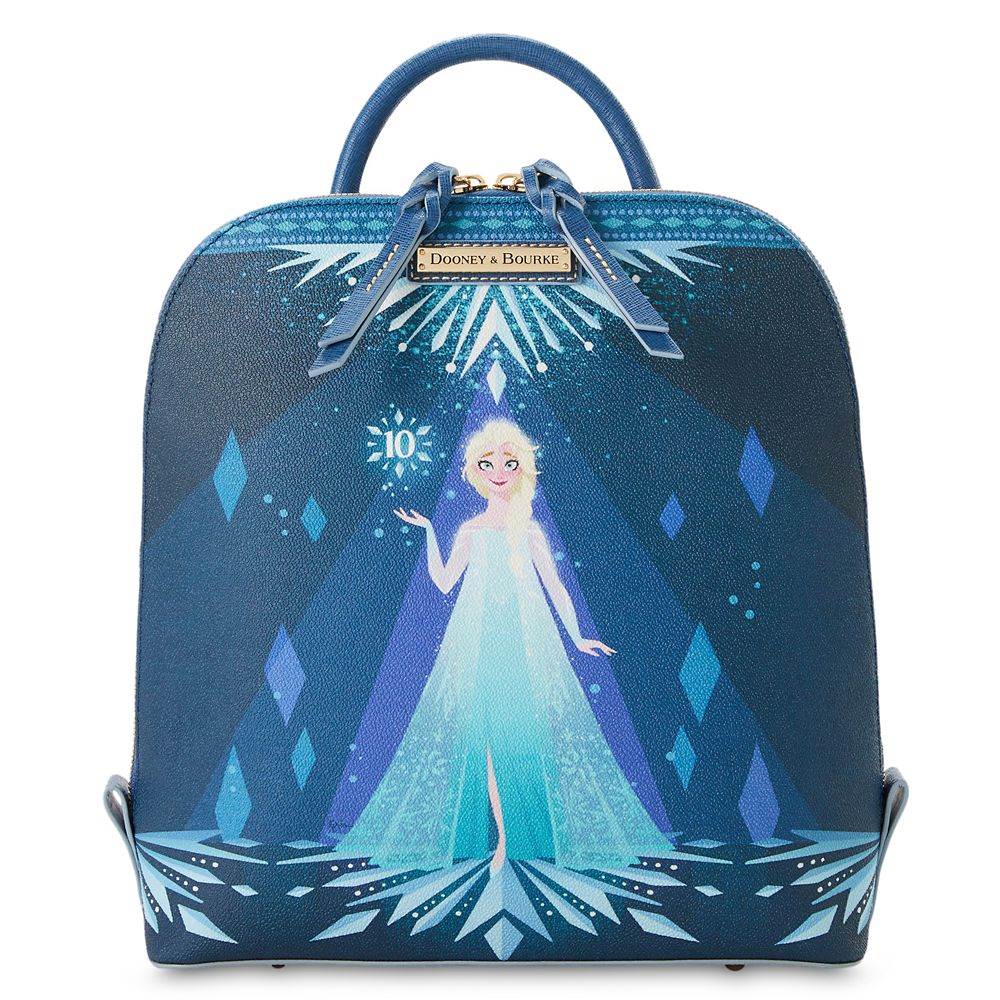 - But that’s hardly it for Queen Elsa! She’s featured solo in her ice palace gown on the front of the backpack with a stylized “10" floating above her right hand to indicate the anniversary year. Additionally the backpack and tote come with a removable Frozen 10th Anniversary leather tag.