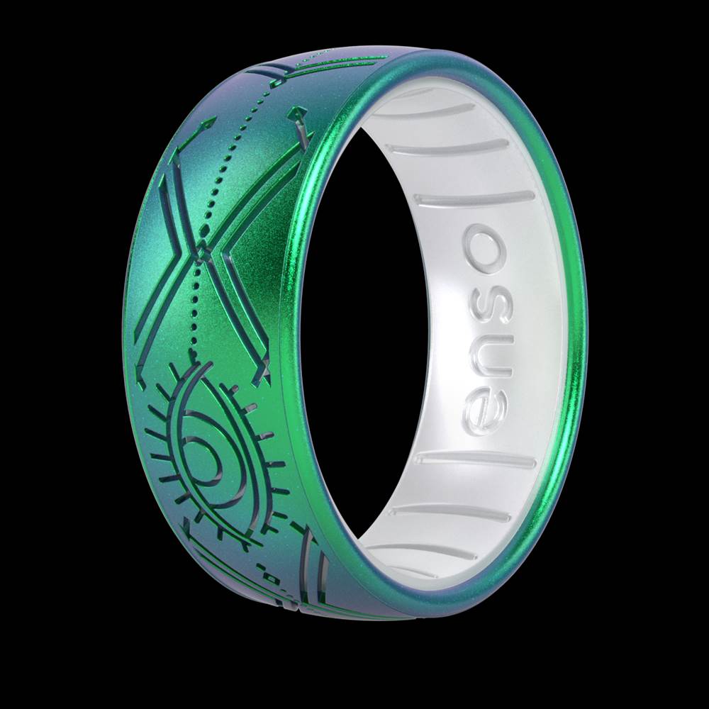 - First up is the “I Put A Spell On You," ring presented in a gorgeous iridescent green similar to Winifred’s signature dress. The laser etched band is white on the interior and this little pop of color shows through the quoted text, images of an eye, dotted line, silhouettes of the sisters and crisscrossing lines.