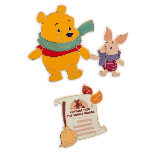 - It showcases stylized representations of Pooh and Piglet on a mini jumbo pin, while the companion pin features a note that reads "venture into the snowy woods."