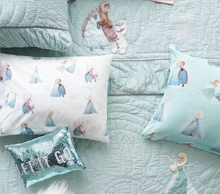 Bring the charm of the film to your kid’s room with a bedding collection from Pottery Barn Kids. A handmade quilt and sheet set with pillowcases are decorated with embroidered designs of Anna, Elsa, and Olaf, hand-braided hair detail on Anna and Elsa, and sequins to make Elsa’s dress shimmer.