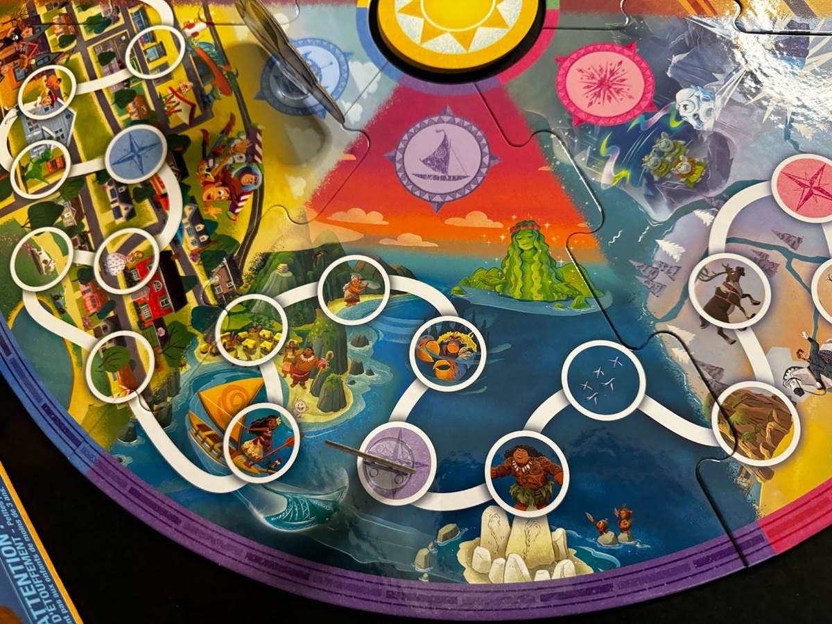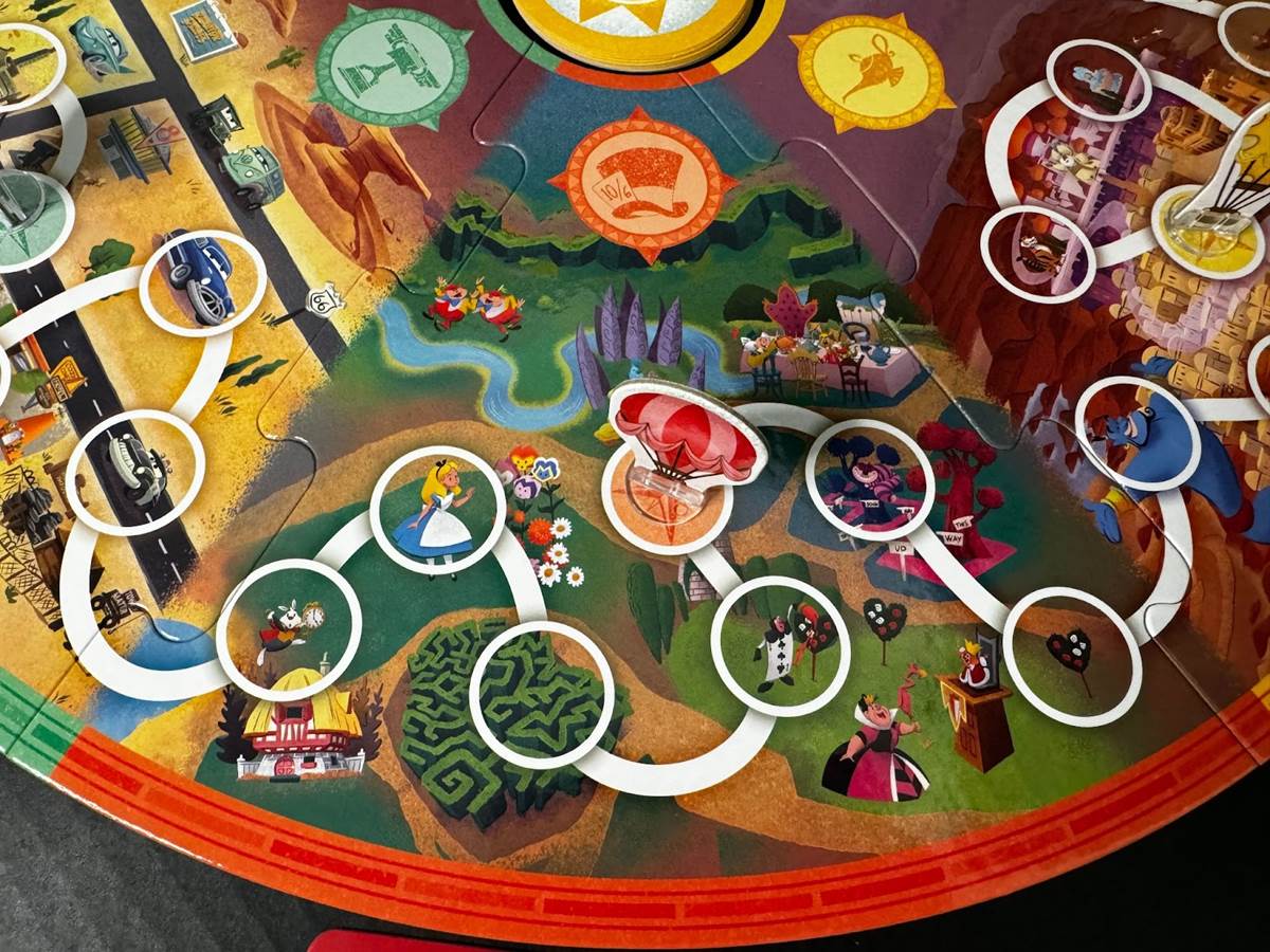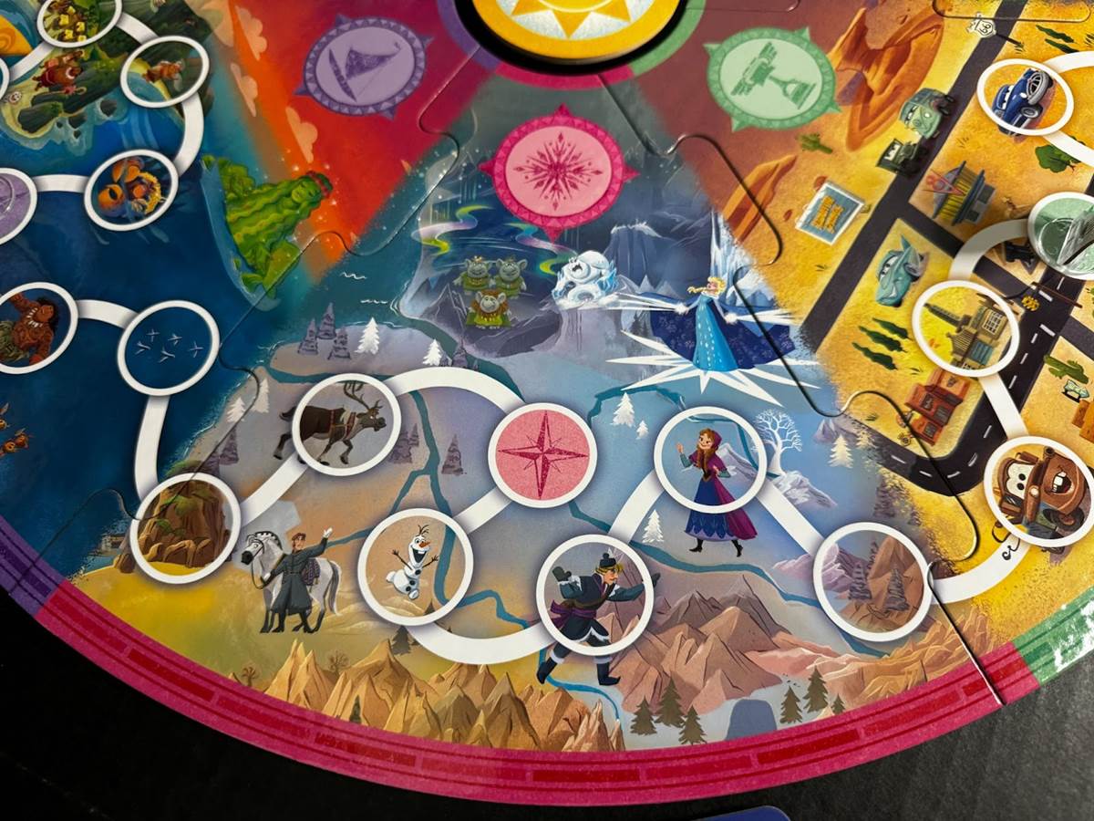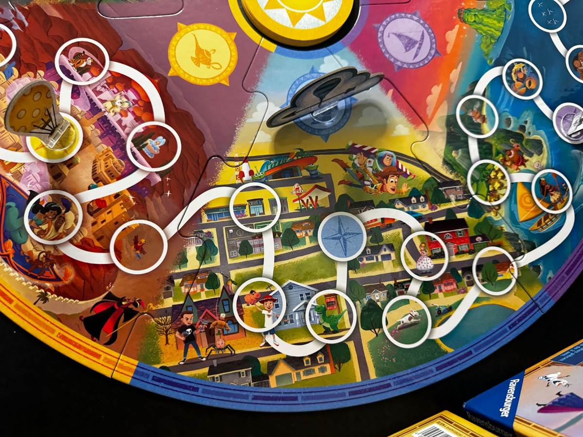 Speaking of the regions, the artwork on Disney Around the World is very appealing, and Disney fans will love examining each slice closely. The board also assembles like a puzzle, with each slice representing its own piece. Take a clooser look at the worlds of Aladdin…