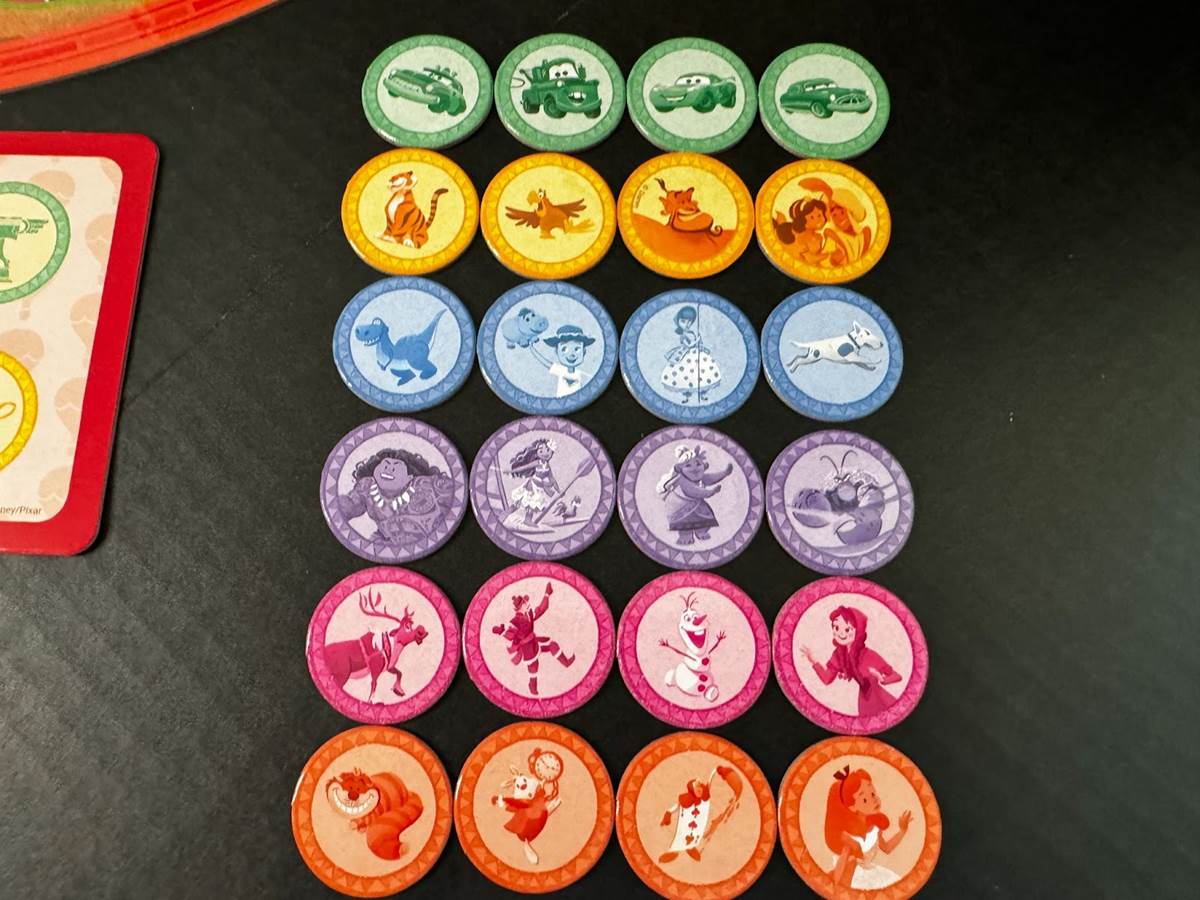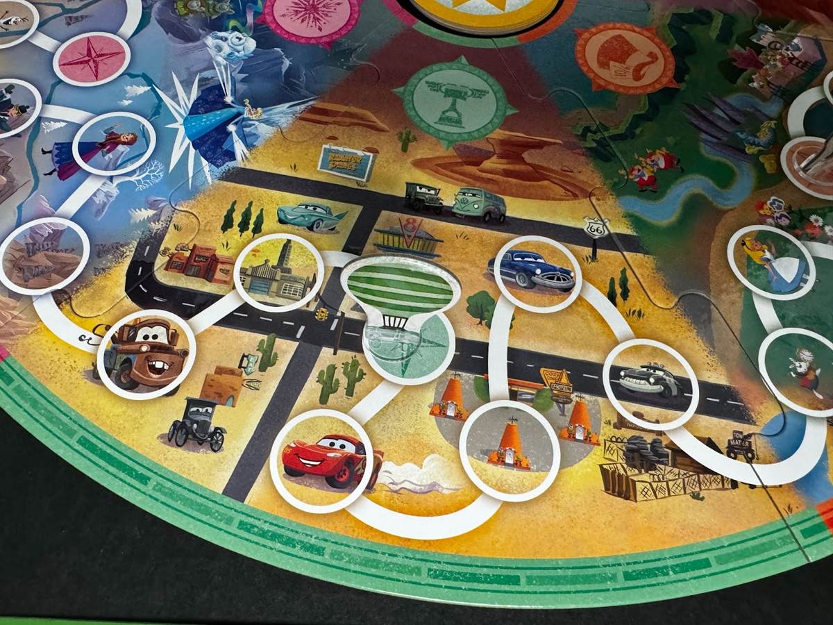 Each player is given a hot air balloon (red, yellow, green, or blue) as their pawn, using it to navigate through lands inspired by Disney’s Aladdin, Alice in Wonderland, Frozen, and Moana, plus Pixar’s Cars and Toy Story. Your hot air balloon comes with a passport and the goal is to be the first to collect a stamp from four regions.