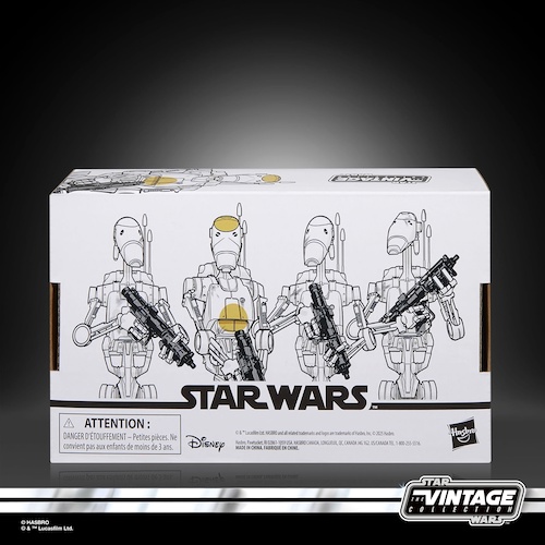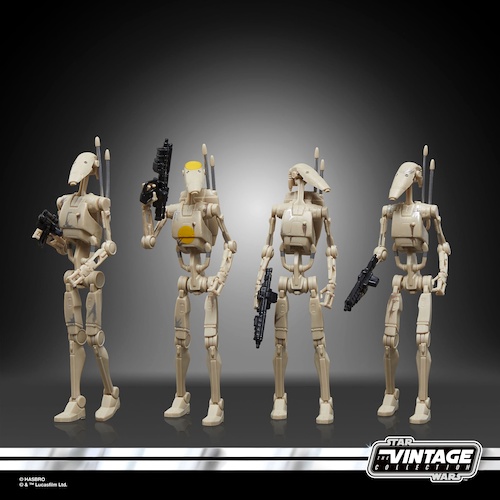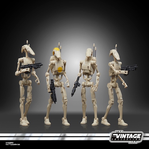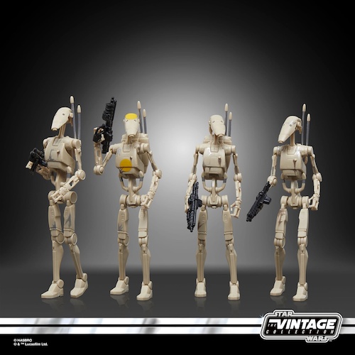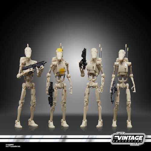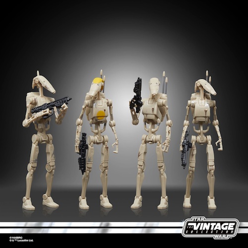 Star Wars: The Vintage Collection Battle Droid 4-Pack ($54.99) - “The soulless ranks of Separatist armies are dominated by tall, thin B1 battle droids built as mechanical imitations of their Geonosian designers. Based on battle droids from STAR WARS: THE PHANTOM MENACE, this 3.75-inch-scale figure makes a great addition to any fan’s collection. Features movie-accurate deco and multiple points of articulation. This troop-building pack comes with removable backpacks, droid antennas, and blaster rifles for each figure. Display your fandom on your shelf with the unique character art on the closed box outer package with Kenner branding."