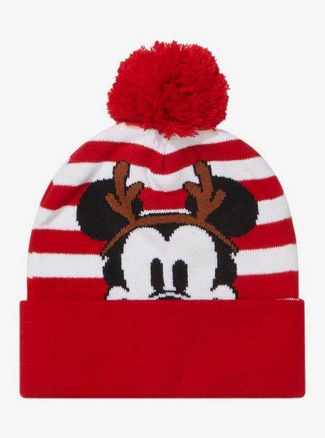 Mickey Mouse is having some fun this winter with reindeer antlers on this red pom beanie. The red and white stripes are perfectly festive and Mickey’s mischievous expression has us sold. Put it on the shopping list!