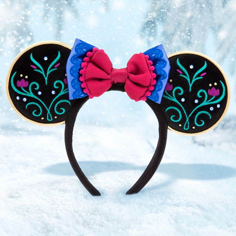 - As seen above, Anna from Frozen is one of the characters featured and this look is inspired by her travel outfit from the film. The black ears are accented with emerald and magenta flower filigree and gold trim; while a large blue bow, secured to a smaller magenta bow rests in the center of the headband.