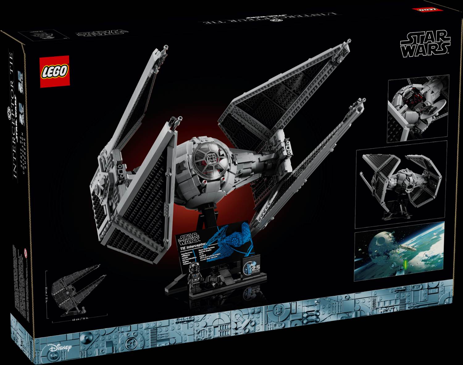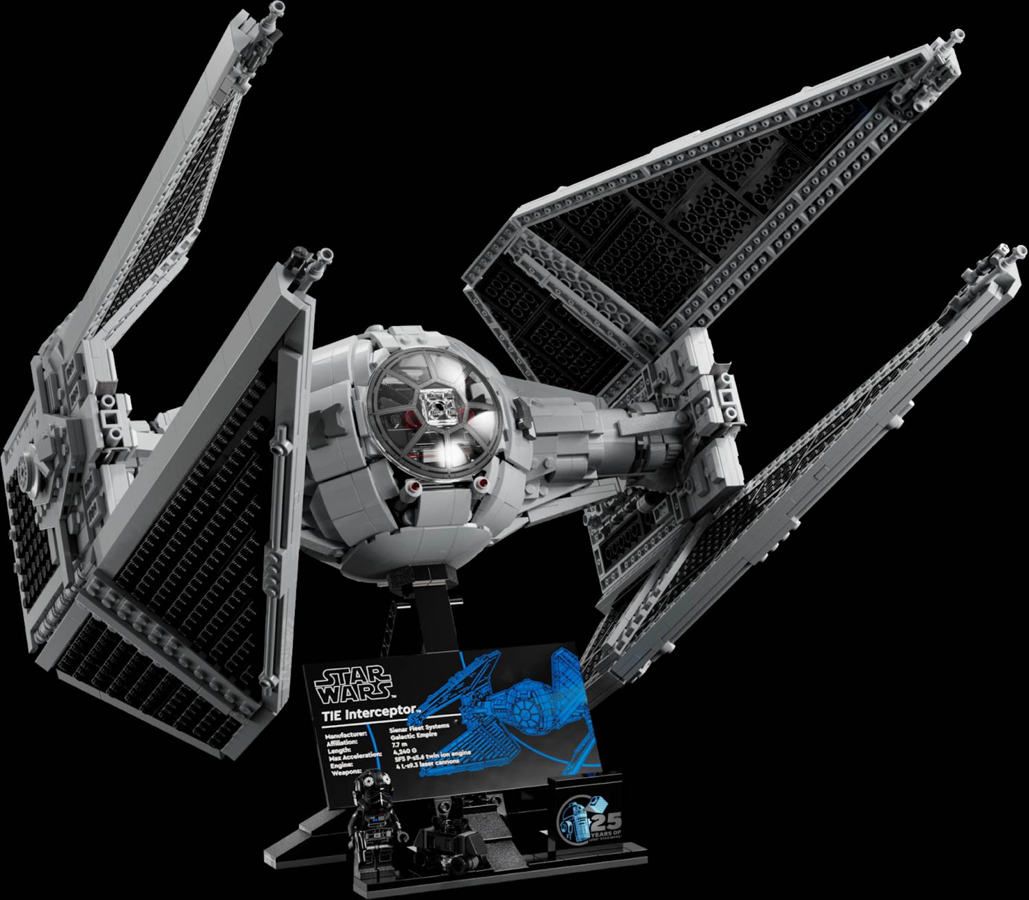 - LEGO.com: “Spark memories of classic Star Wars™ saga action with this LEGO® Star Wars Ultimate Collector Series buildable TIE Interceptor model (75382) for adults. The iconic TIE Interceptor starfighter was part of the first-ever launch of LEGO Star Wars UCS sets in the year 2000; now it’s back and redesigned for even greater authenticity. Revel in buildable details, such as its distinctive wings, cockpit interior, laser cannons and rear engine. This collectible brick-built vehicle measures over 16 in. (40 cm) long and has a display stand with an information plaque, a LEGO Star Wars 25th anniversary brick and space for the included TIE Pilot LEGO minifigure and LEGO mouse droid figure."