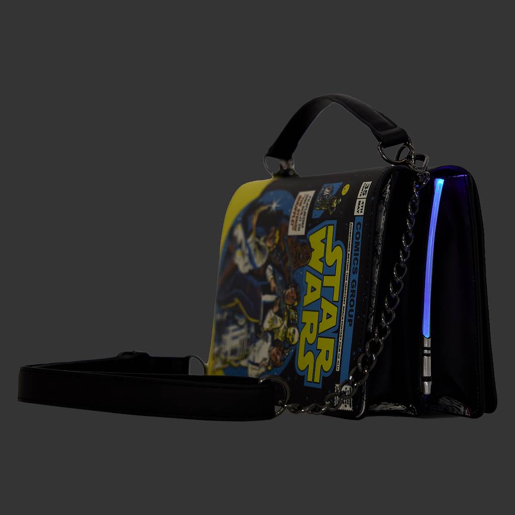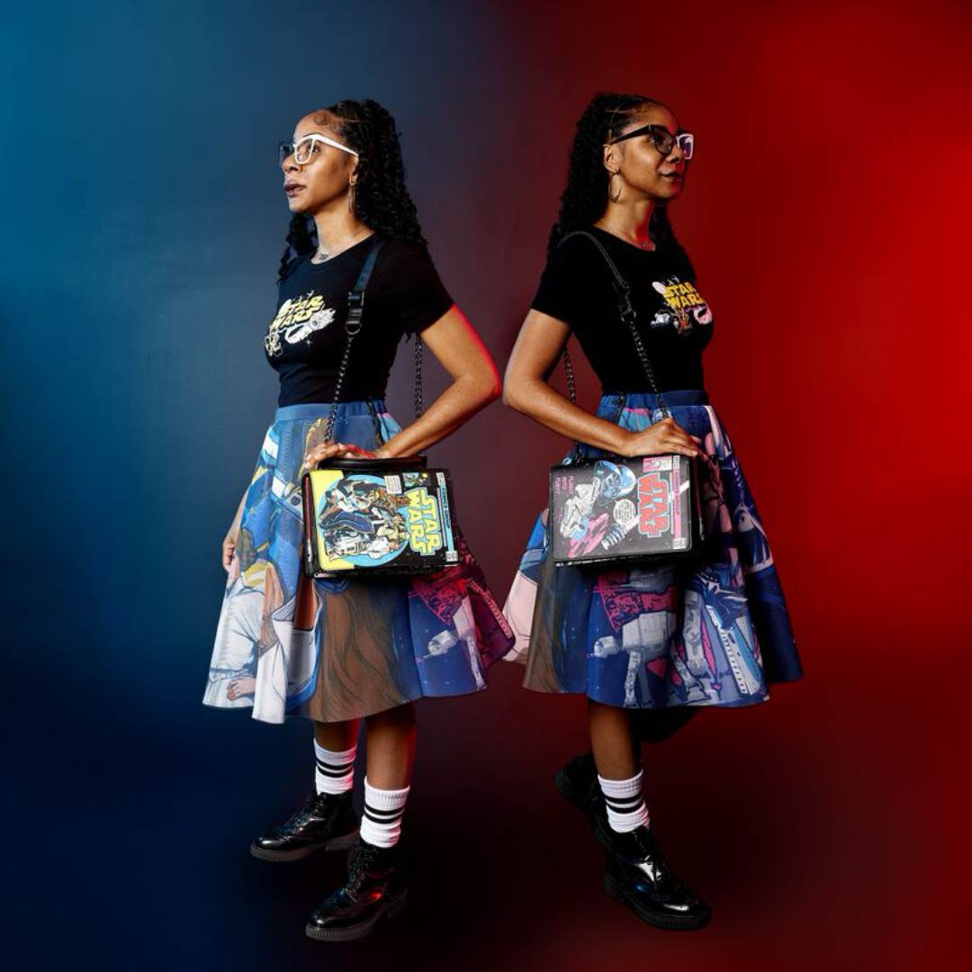 Finally we come to Loungefly’s accessories and Stitch Shoppe apparel. This fashionable capsule collection launched last summer and features a Star Wars logo top, vibrant double-sided Light vs. Dark Side skirt, and a reversible crossbody bag decorated with vintage artwork and LED lightsaber designs.