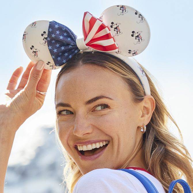 - This particular headband has a white base and is decorated with old school Mickey Mouse icons wrapped in the flag. A complimentary bow featuring the Stars and Stripes sits in the center, providing a very traditional Americana look.