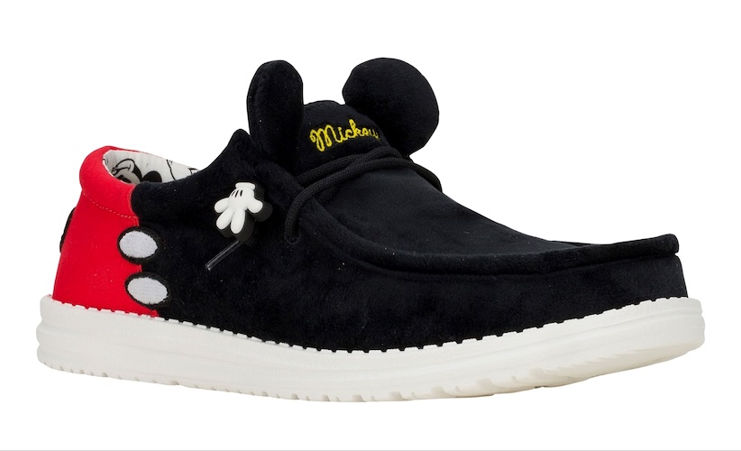 - The Men’s shoe is the Disney Mickey Mouse Wally. Says HEYDUDE: “We really gave this collab shoe the white glove treatment. Disney x HEYDUDE Wally Funk Mickey Mouse features the character’s iconic coloring, a Mickey Mouse hand lace cover, Mickey Mouse ears and black and white Mickey Mouse head print lining. A truly magical shoe for Disney lovers of all ages."