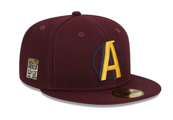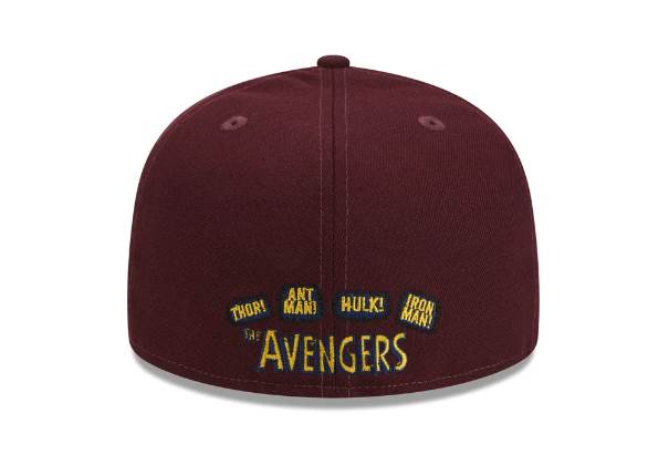 - The Avengers Classic 59FIFTY Fitted Cap features an embroidered Avengers logo at the front panels with a Marvel Comics Group patch at the right-wear side and an Avengers wordmark at the rear.