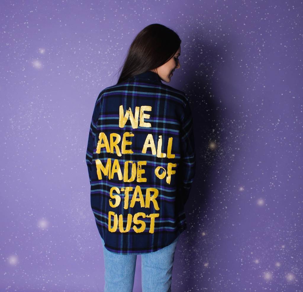 - Cakeworthy Wish Flannel – ($54.95) Unisex flannel adorned with wishing stars flying across the sleeve, Valentino and Star on the front pocket, and the quote “We Are All Made of Stardust" in gold glittering print on the back.