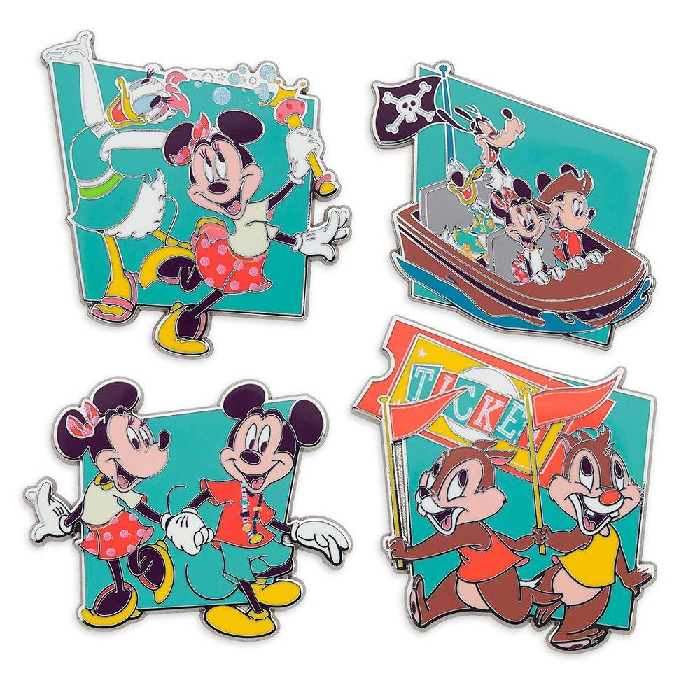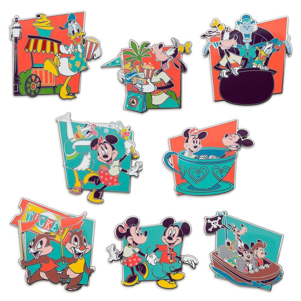 - Play in the Park 2024 series includes: Mickey and Minnie holding hands, Mickey and Minnie on Mad Tea Party, Donald at popcorn stand, Goofy shopping, Minnie and Daisy with bubble wand, Mickey and Minnie with Goofy on Pirates of the Caribbean, Donald and Goofy with Hitchhiking Ghost, and Chip 'n Dale with admission ticket