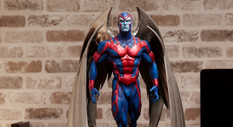 - The Archangel Premium Format Figure includes three interchangeable portraits: a cowled head, one with the character's gold Death mask, and an unmasked head that reveals Warren's flowing blonde hair.