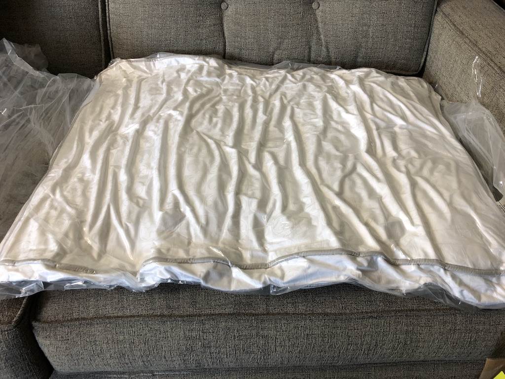 - The cotton cover is coated with Protecht® a “sustainable bio-based technology for moisture wicking and energy saving" that’s “derived from castor oil."
