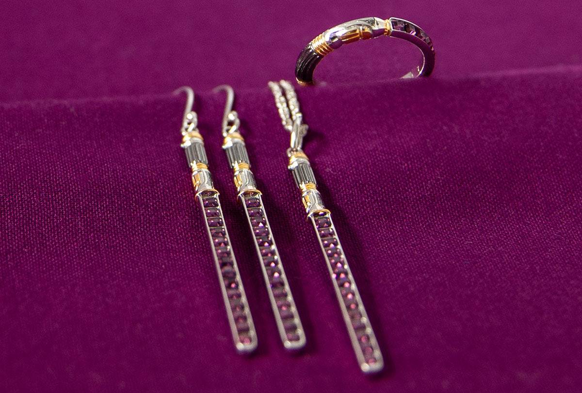 Crystal Lightsaber pendants hang from an adjustable sterling silver rope chain with signature tag and graceful extender weight, while the ring wraps uninterrupted around the finger. The earrings hang from matching nickel-free sterling silver French wires.