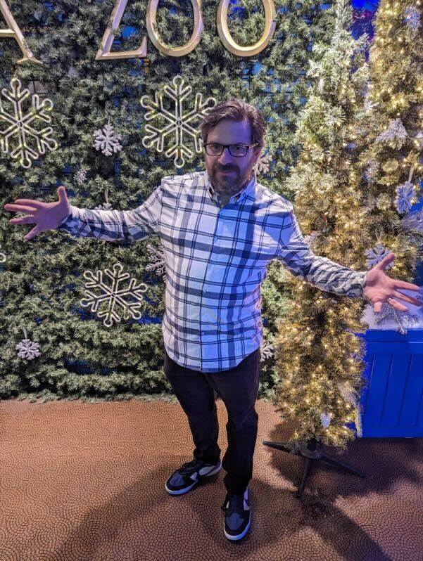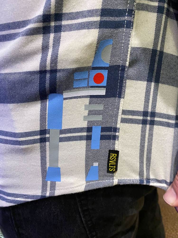 Next I tried out the “Dagobah Flannel Master" shirt ($72) and I’m into this one just as much! Where the Artoo version used blue and grey highlights familiar from the droid’s iconic design for the pattern, more earthy tones like green and tan are represented here, and there’s a fun little sketch of our favorite diminutive Jedi Master in his adopted home on the swamp planet from The Empire Strikes Back. I could see myself wearing both of these to any number of occasions where t-shirts (or tiki shirts) aren’t appropriate.