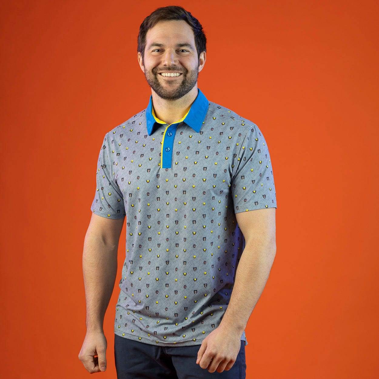 - Next up is “Lil Logans," a grey shirt with claw marks for the background and various Wolverine heads to make up the repeating, allover pattern. A blue collar adds some interesting contrast and provides more options for pairing and accessorizing.