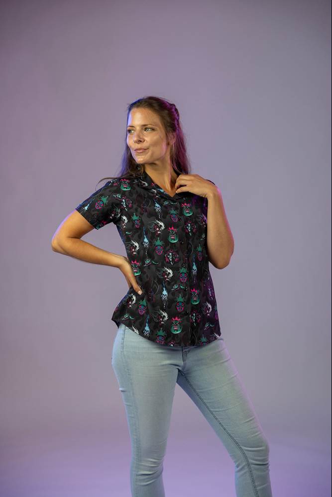 - The first concoction is “Disney Scary Tale," a solid black shirt decorated with the faces of Curella, Maleficent, Scar, Jafar and more presented in mysterious hues of green, pink, purple and red.