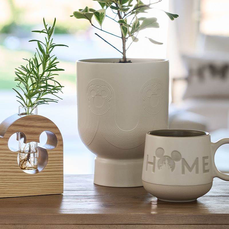 - The traditional “HOME" mug with a Mickey head and castle icon replacing the “O" is part of the collection alongside a new rounded planter with a retro artwork grid.