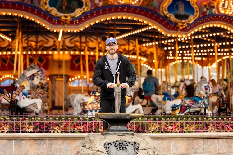 Chris Evans Pulls the Sword from the Stone at the Magic Kingdom