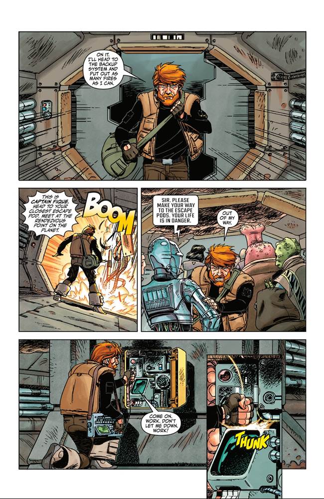 Hyperspace Stories has been a messy, uneven ride since its launch 16 months ago, but when it hits it hits, as it does in the final story, entitled “The Little Things." This last tale is set during the events of Return of the Jedi (in honor of that film’s 40th anniversary, according to the cover– they really got it in at the last minute) and begins with a refugee ship called the Dorlanna narrowly escaping Imperial capture in the Outer Rim. In the ship’s cockpit, an engineer named Basch scrambles desperately to keep the vessel in one piece as its passengers evacuate to the planet below. His quest takes him to the hold, where he encounters a young alien girl carrying the same Wookiee doll we’ve seen pop up in every other issue of Hyperspace Stories. The girl escapes, but accidentally leaves the doll behind for Basch to take care of until they hopefully meet again.