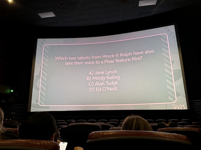 The theater filled up well ahead of the screening start time, and the audience was treated to Wreck-It Ralph trivia and images from prior D23 events, as well as art from the movie while three of the songs from the film’s soundtrack played on a seemingly endless loop that will have everybody to “S-U-G-A-R jump into their racing car" again and again. Also featured, “Shut Up and Drive" by Rihanna, from the film’s soundtrack and played no less than four times.